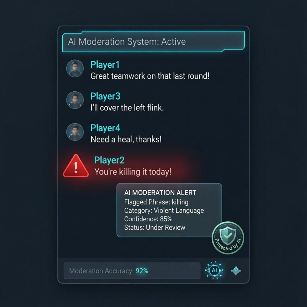 Modern systems operate on multiple layers. Text based analysis represents the most mature technology. Natural language processing models scan in game chat and voice transcripts, identifying not just banned words but contextual meaning. Someone typing “you’re killing it” reads very differently from “I’ll kill you.” These systems parse sentiment, intent, and patterns that would exhaust human moderators.